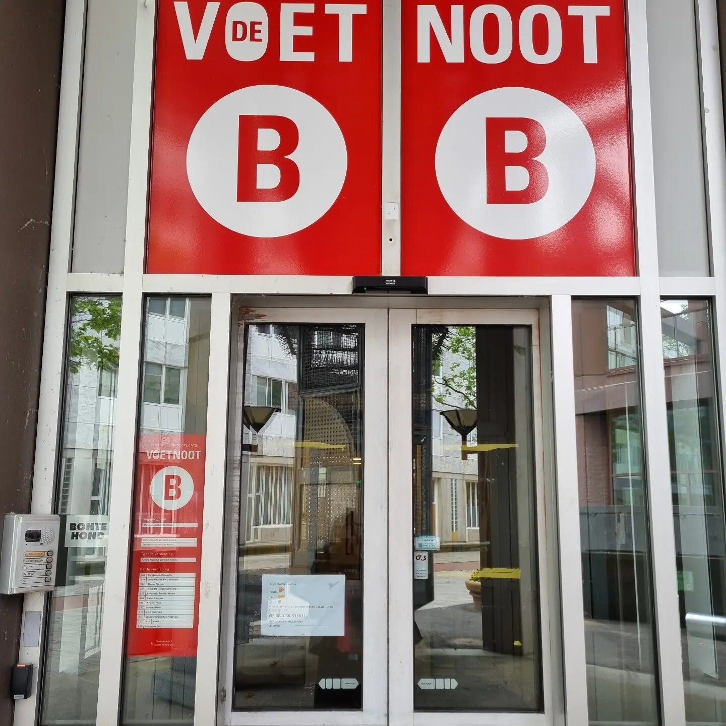 De ingang van het gebouw waar het atelier gevestigd is. Creatieve Broedplaats de Voetnoot. Links een belpaneel, aanbellen op 3 hoog.