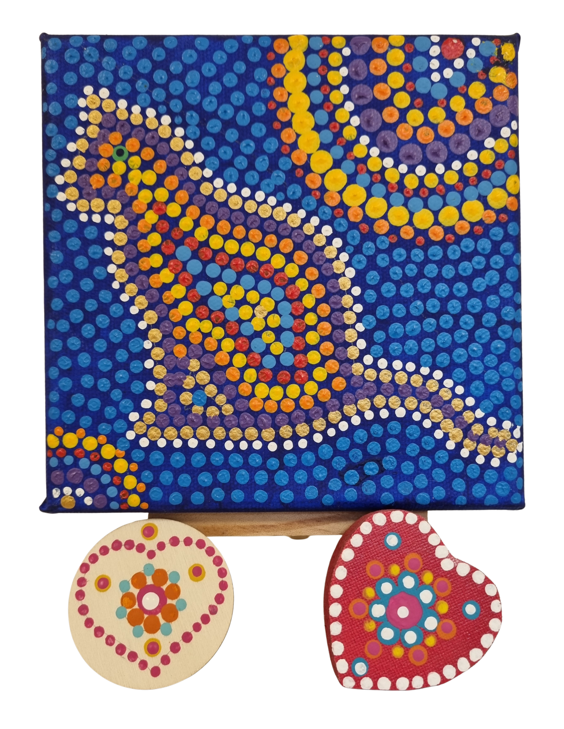 Tijdens deze workshop ga je een zelf gekozen ondergrond versieren met de stippenkunst techniek. Er zijn verschillende basismaterialen aanwezig in het atelier. denk aan bordjes, canvasdoeken, sleutelhangers, houten plaatjes waar je bijvoorbeeld magneten van kunt maken en nog meer.